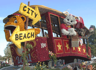 We think this float is from AAA, Southern California. What a cheerful ride!